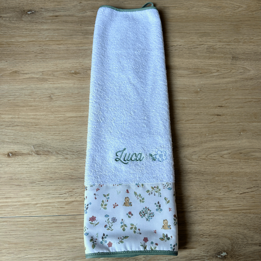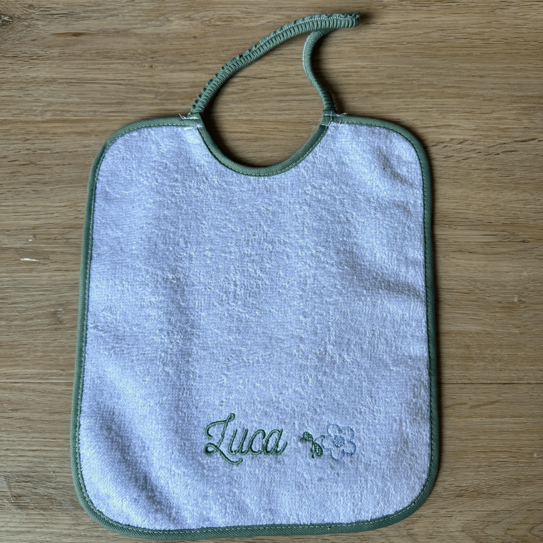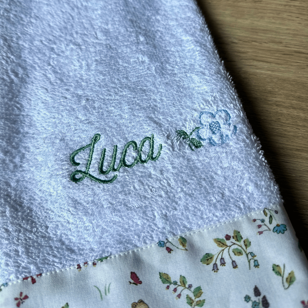 Per evitare scambi o smarrimenti, ogni elemento è personalizzabile con il nome del vostro bambino o della vostra bambina, accanto al dolce ricamo a fiorellino.