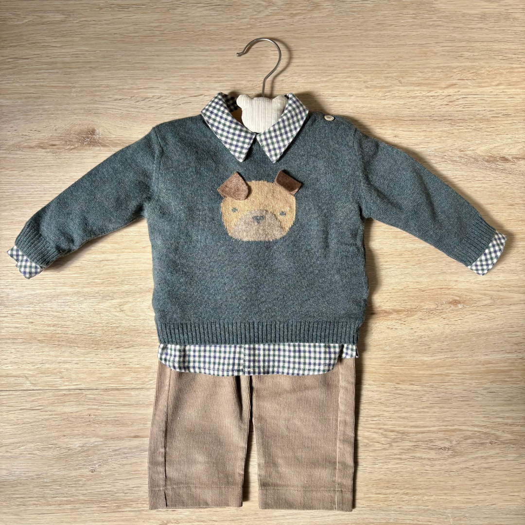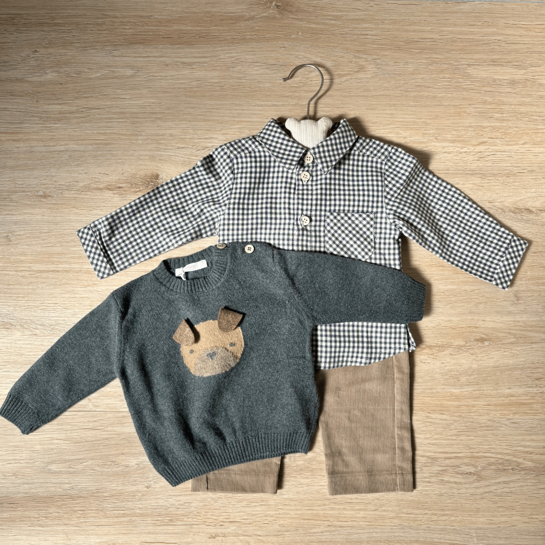 Completino tre pezzi Coccodè Firenze, pratico e raffinato, pensato per i primi outfit del tuo bambino. Il maglioncino in morbido verde pino regala calore e stile, i pantaloni color torroncino sono comodi e versatili grazie all’elastico in vita, mentre la camicia a quadretti blu e verde pino completa il look con un tocco di eleganza senza tempo.