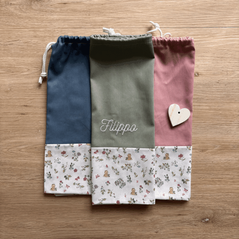 Ogni pezzo può essere ricamato con il nome del tuo bambino/a, accanto al dolce ricamo a fiorellino, per evitare scambi o smarrimenti a scuola.