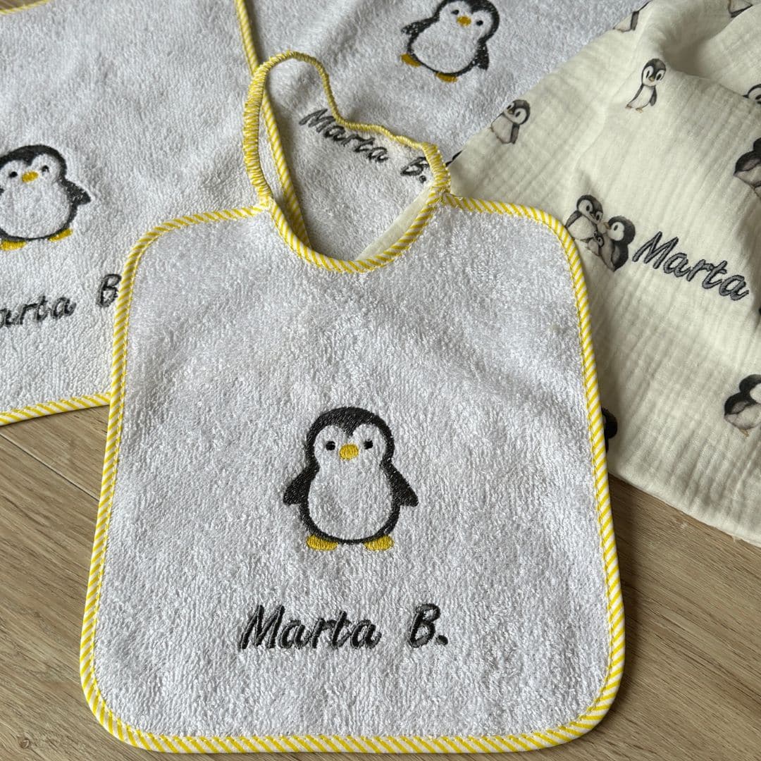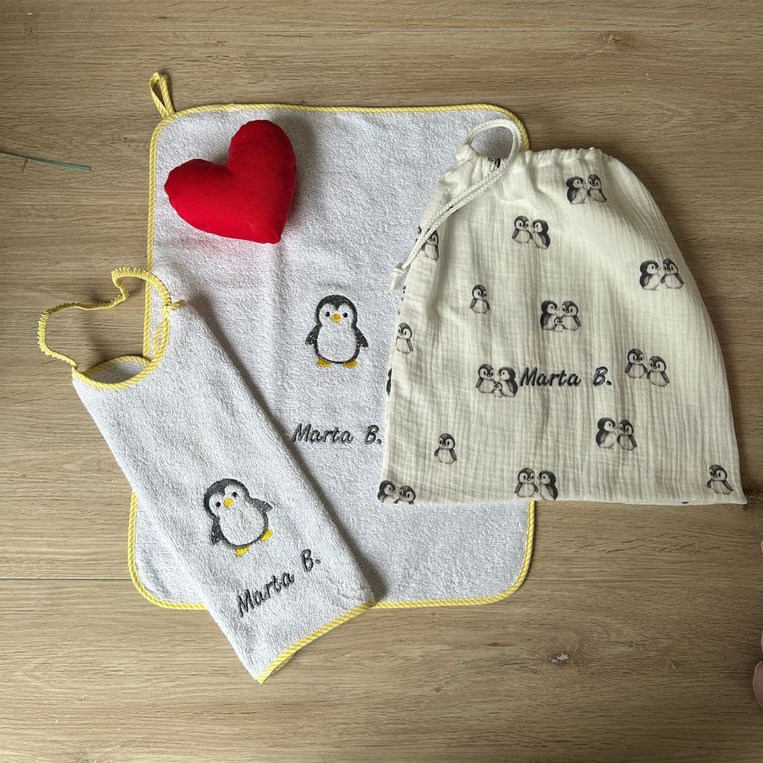 Ogni elemento è personalizzabile con il nome del vostro bambino o bambina, per evitare smarrimenti e rendere ogni giorno speciale. Il ricamo del pinguino dona un tocco di simpatia e tenerezza.