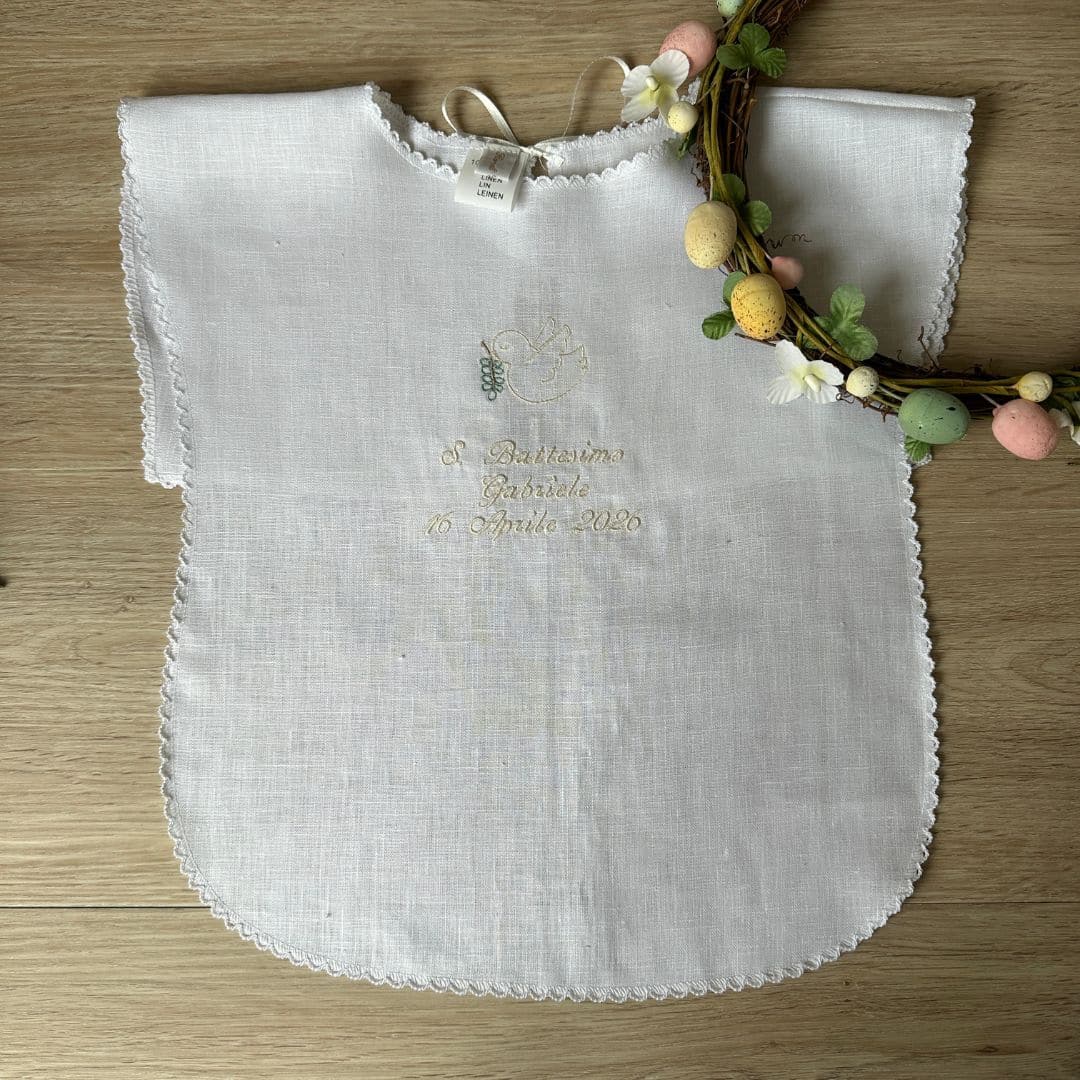 Realizzata con lino di altissima qualità e impreziosita dal ricamo delicato della colomba con il ramo di ulivo, questa vestina è pensata per rispettare la pelle delicata del neonato e offrire al contempo raffinatezza e simbolismo.