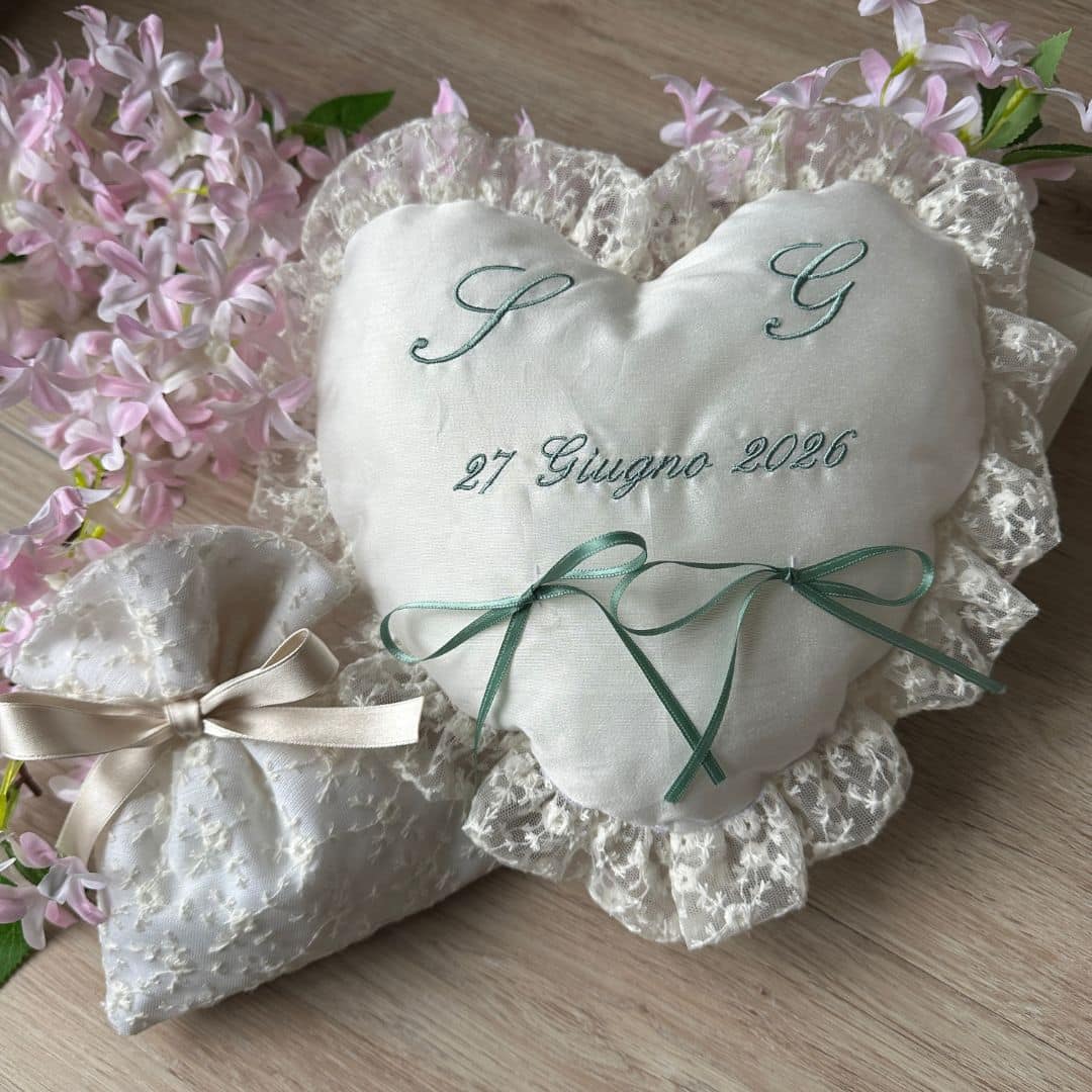 Ogni cuscino è personalizzabile con le iniziali degli sposi e la data del matrimonio, ricamati con cura per rendere unico e irripetibile il vostro giorno speciale. I nastrini in raso avorio permettono di fissare gli anelli con delicatezza e sicurezza.