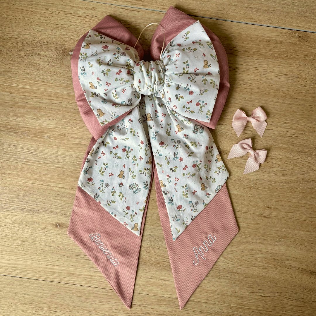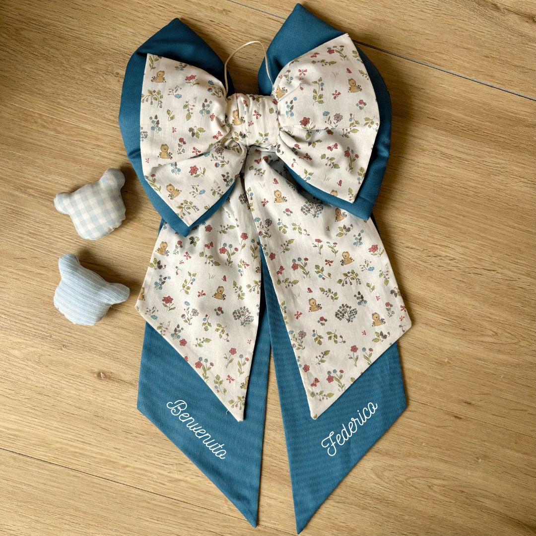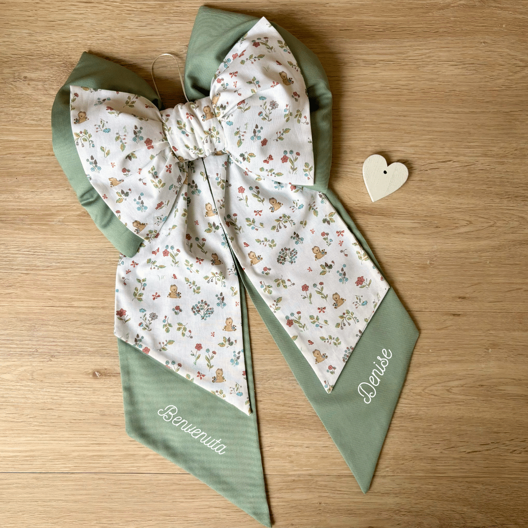 Ogni fiocco è personalizzabile con il nome ricamato del neonato, trasformandosi così in un ricordo unico e prezioso, da appendere alla porta, in cameretta o conservare per sempre.