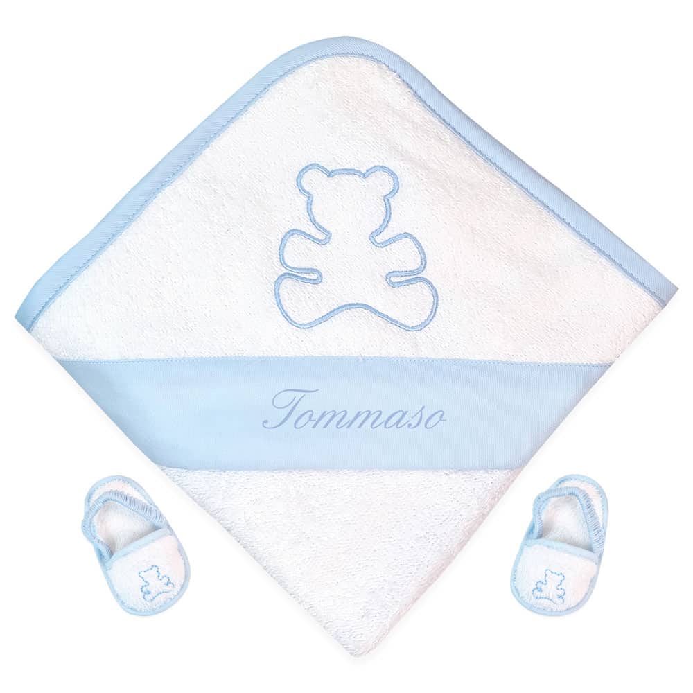 Un accessorio indispensabile per il bagnetto quotidiano, amatissimo dalle mamme per la sua praticità e morbidezza. Il nome ricamato sul cappuccio e il tenero ricamo dell’Orsetto Coccole rendono questo accappatoio unico, perfetto per un regalo che unisce utilità e raffinatezza.