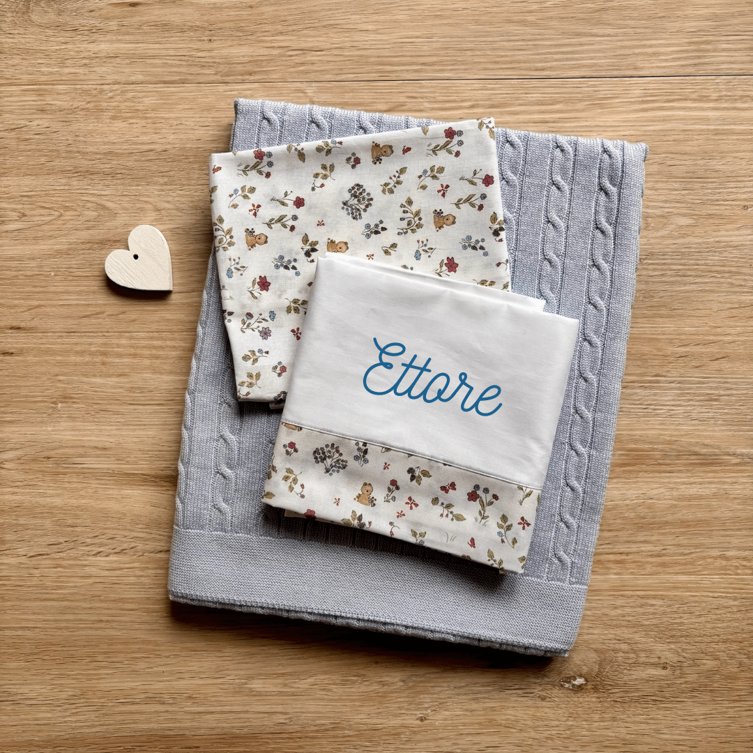 Un set ideale per la culla, pensato per i primi riposini, le coccole quotidiane e i momenti di nanna. Realizzato artigianalmente in Italia con materiali pregiati, è il regalo perfetto per una nascita, un corredino raffinato o per impreziosire la cameretta con stile.