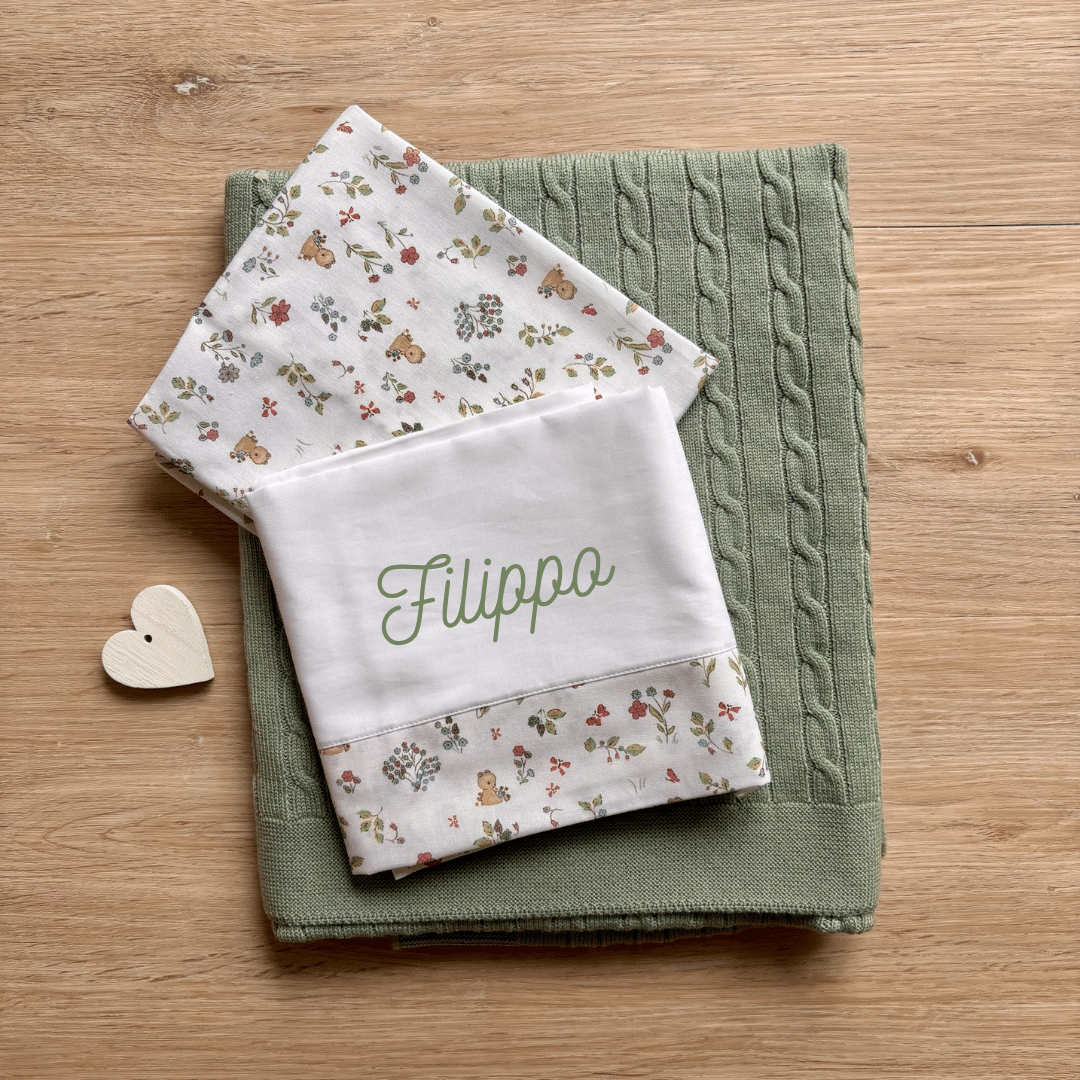 Un coordinato pensato per avvolgere il tuo bambino in un abbraccio caldo, naturale e personalizzato. Il set culla “Orsetto nel Bosco” è composto da: