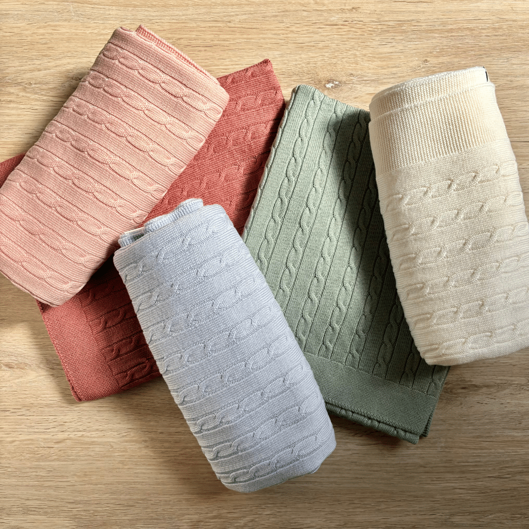 Disponibile in cinque tonalità raffinate — Verde Salvia, Malva, Rosa, Cielo e Panna — questa copertina è un dono unico e funzionale, ideale per culla, carrozzina e come regalo nascita o battesimo.