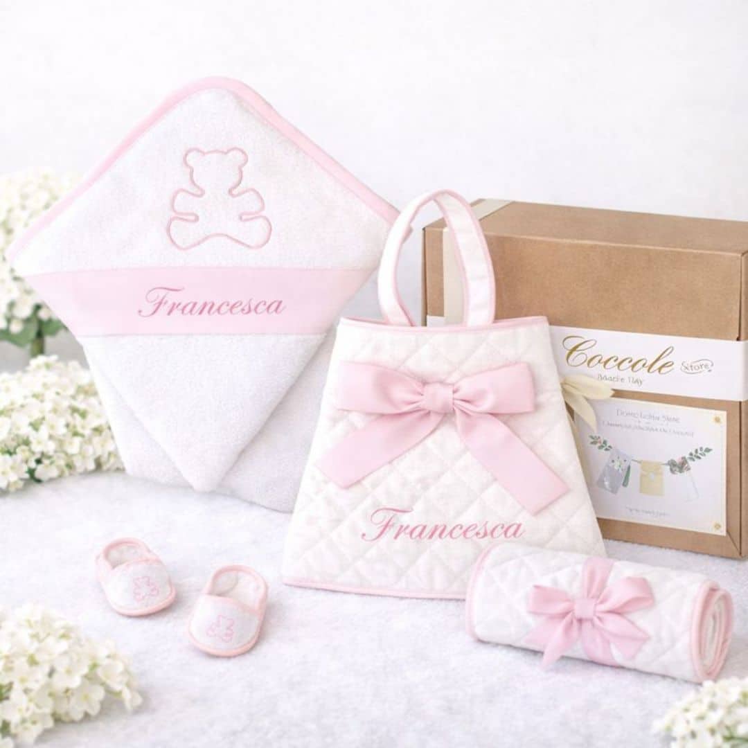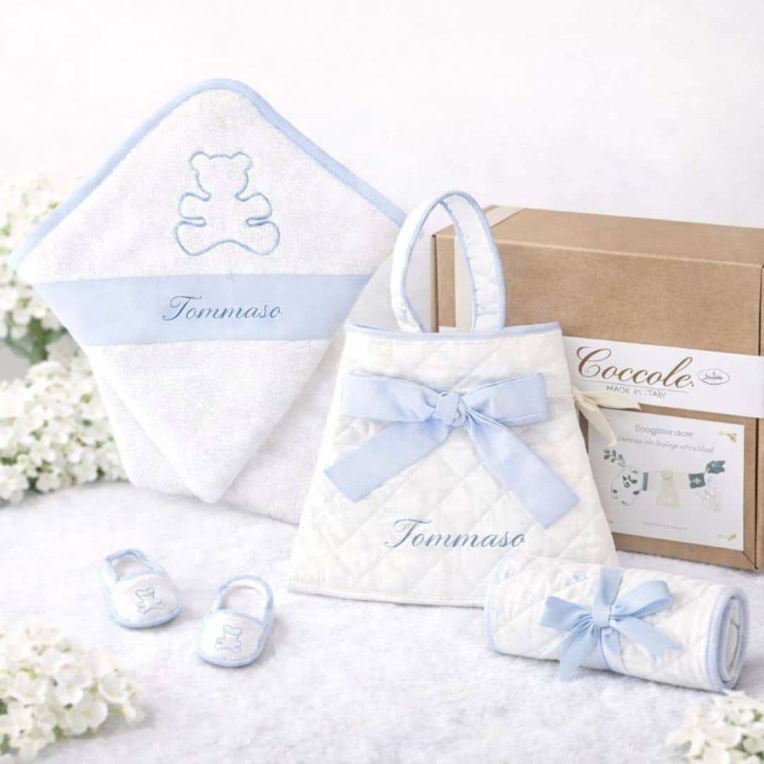 Ogni articolo può essere personalizzato con il nome del tuo bimbo, ricamato con cura sartoriale nel classico carattere corsivo. Se preferisci, puoi indicare nelle note eventuali pezzi da lasciare senza ricamo.