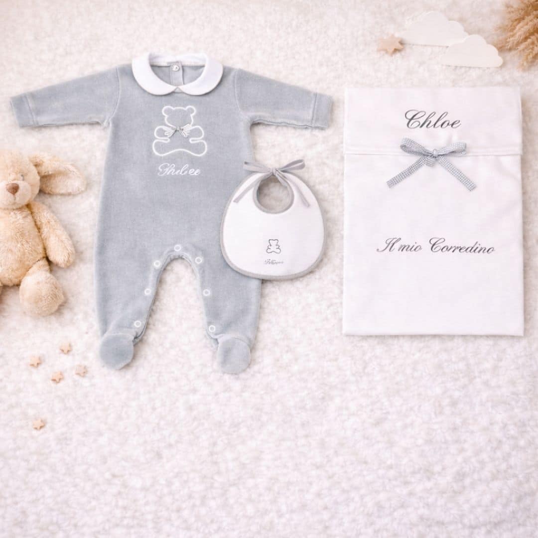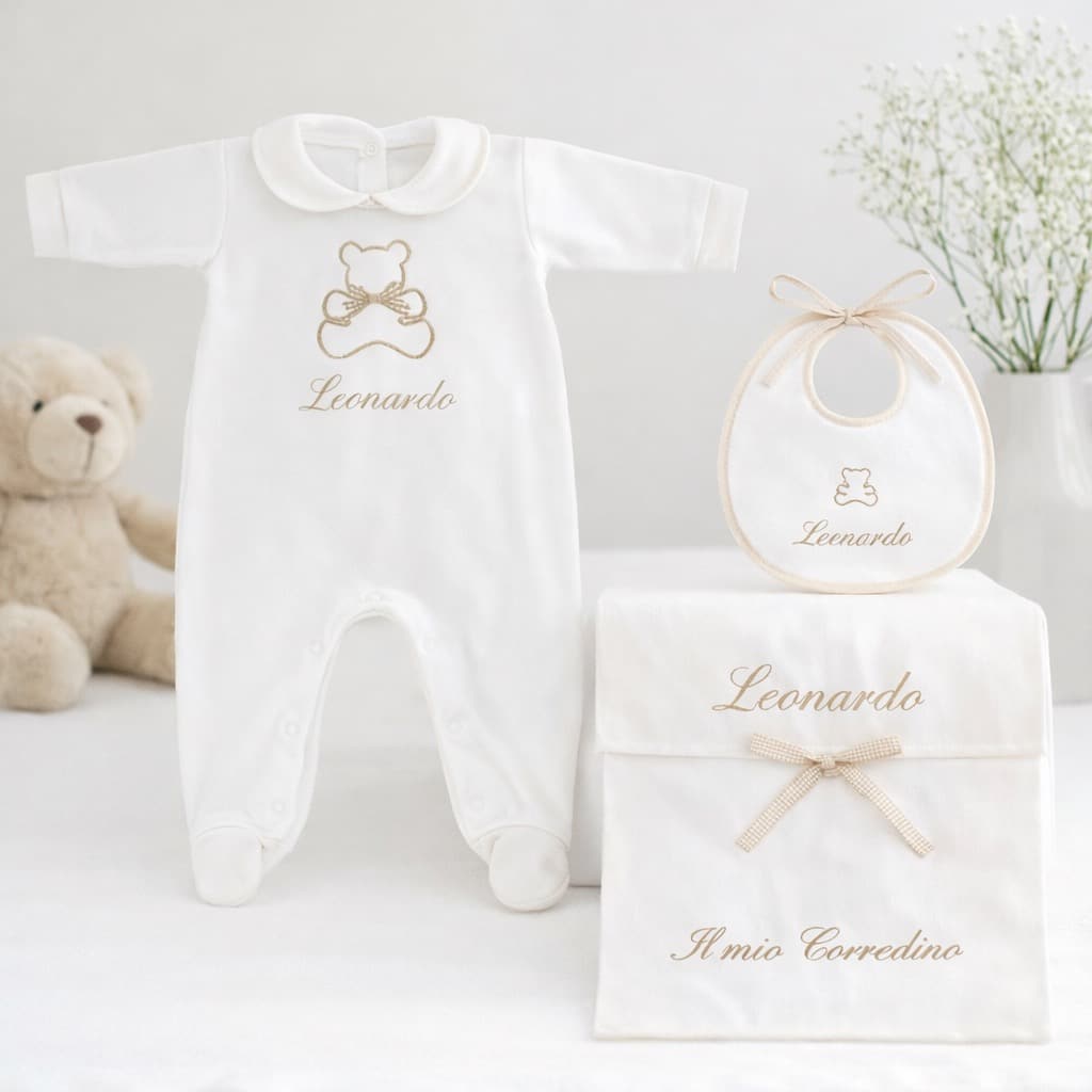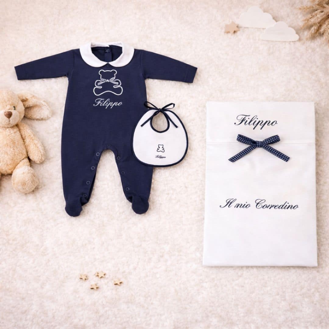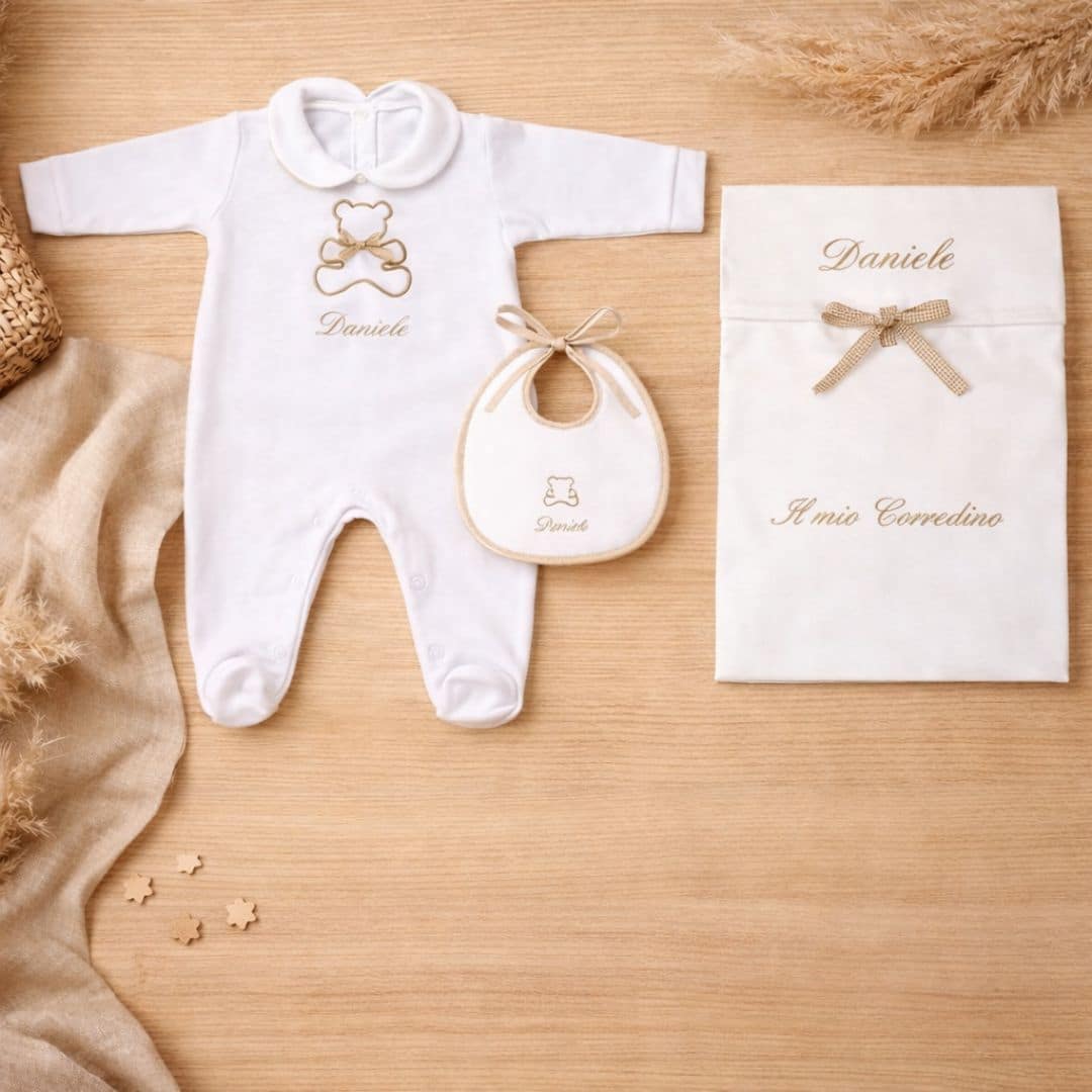 Il Corredino Personalizzato Nascita Orsetto è pensato per accogliere il tuo bambino con dolcezza e stile. Realizzato con tessuti di alta qualità, unisce eleganza e praticità, ed è perfetto come dono raffinato per la nascita o come prima scelta per le mamme che desiderano un corredino speciale.