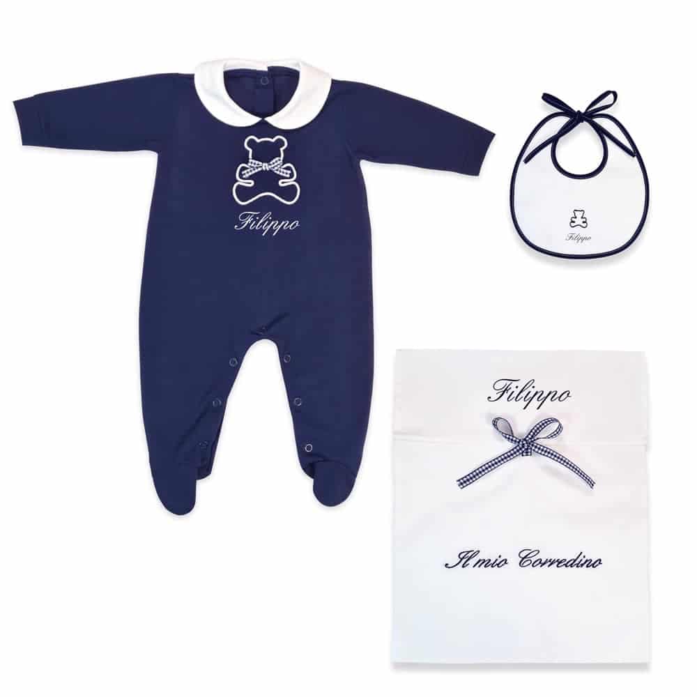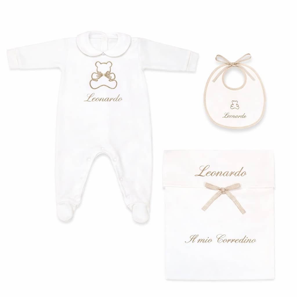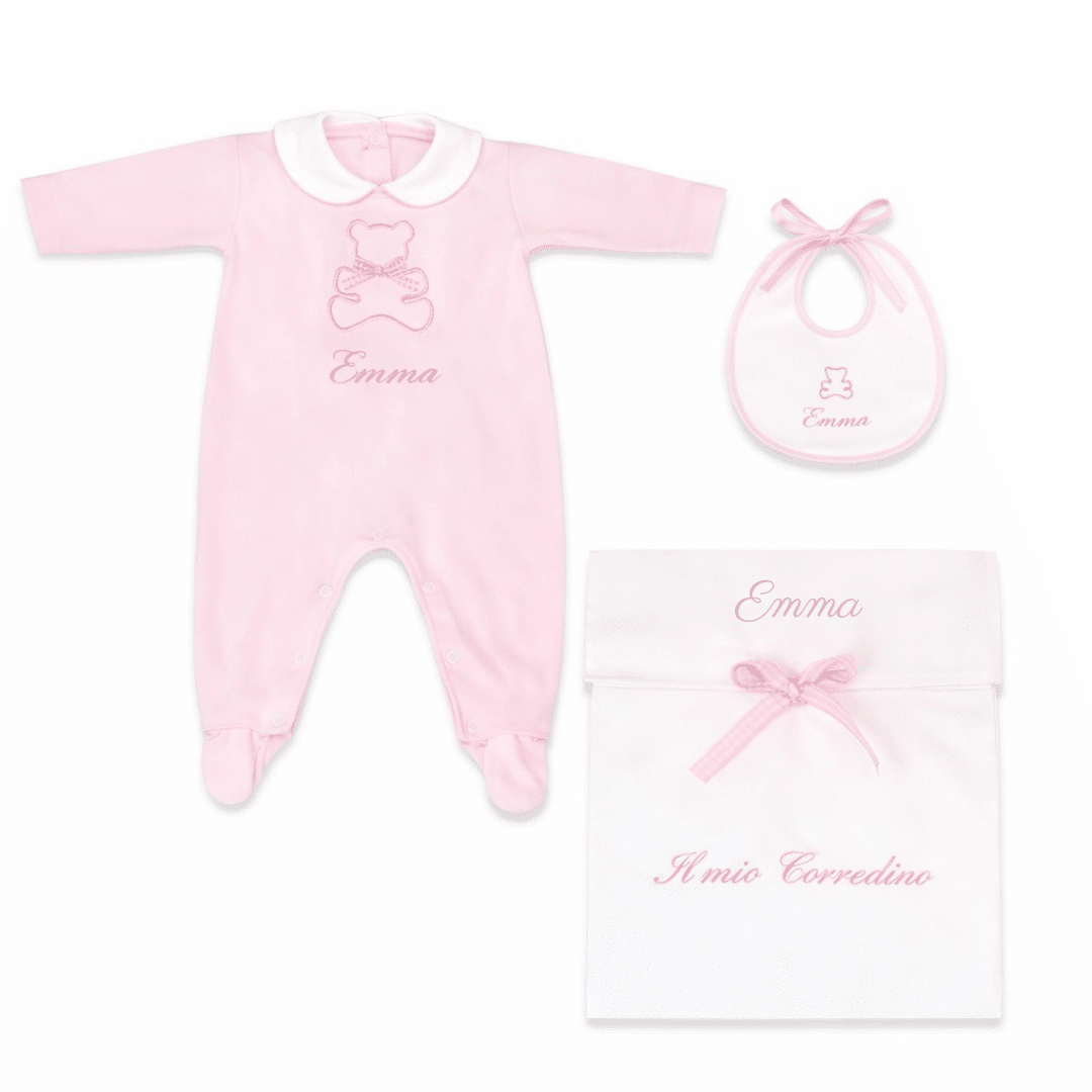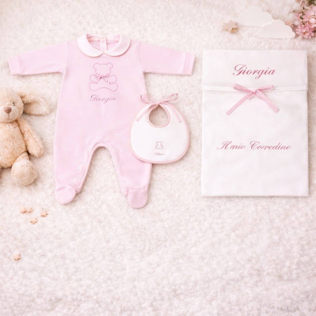 Il Corredino Personalizzato Nascita Orsetto è pensato per accogliere il tuo bambino con dolcezza e stile. Realizzato con tessuti di alta qualità, unisce eleganza e praticità, ed è perfetto come dono raffinato per la nascita o come prima scelta per le mamme che desiderano un corredino speciale.