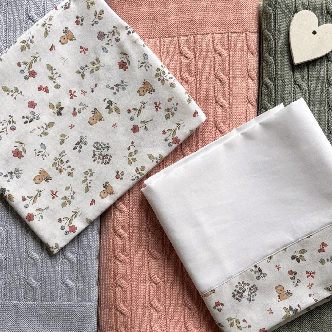 La fantasia esclusiva, tenera e ricca di dettagli, raffigura piccoli orsetti immersi in un prato fiorito dai toni naturali e delicati. La personalizzazione è ricamata con cura e può essere realizzata in tre varianti, coordinate alle nostre linee tessili: Malva – romantica e raffinata, Blu Avio – elegante e profonda, Salvia – fresca e naturale.