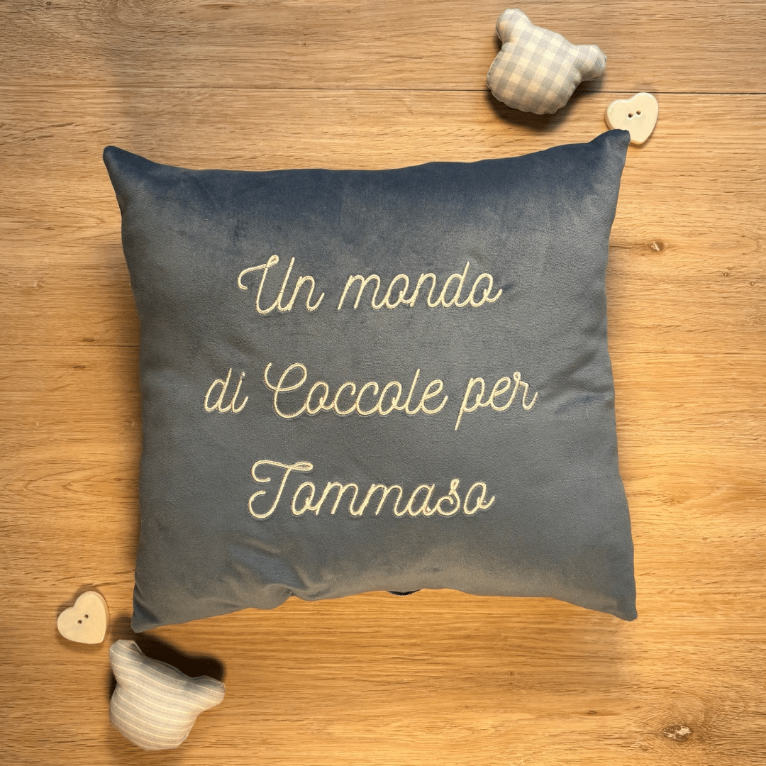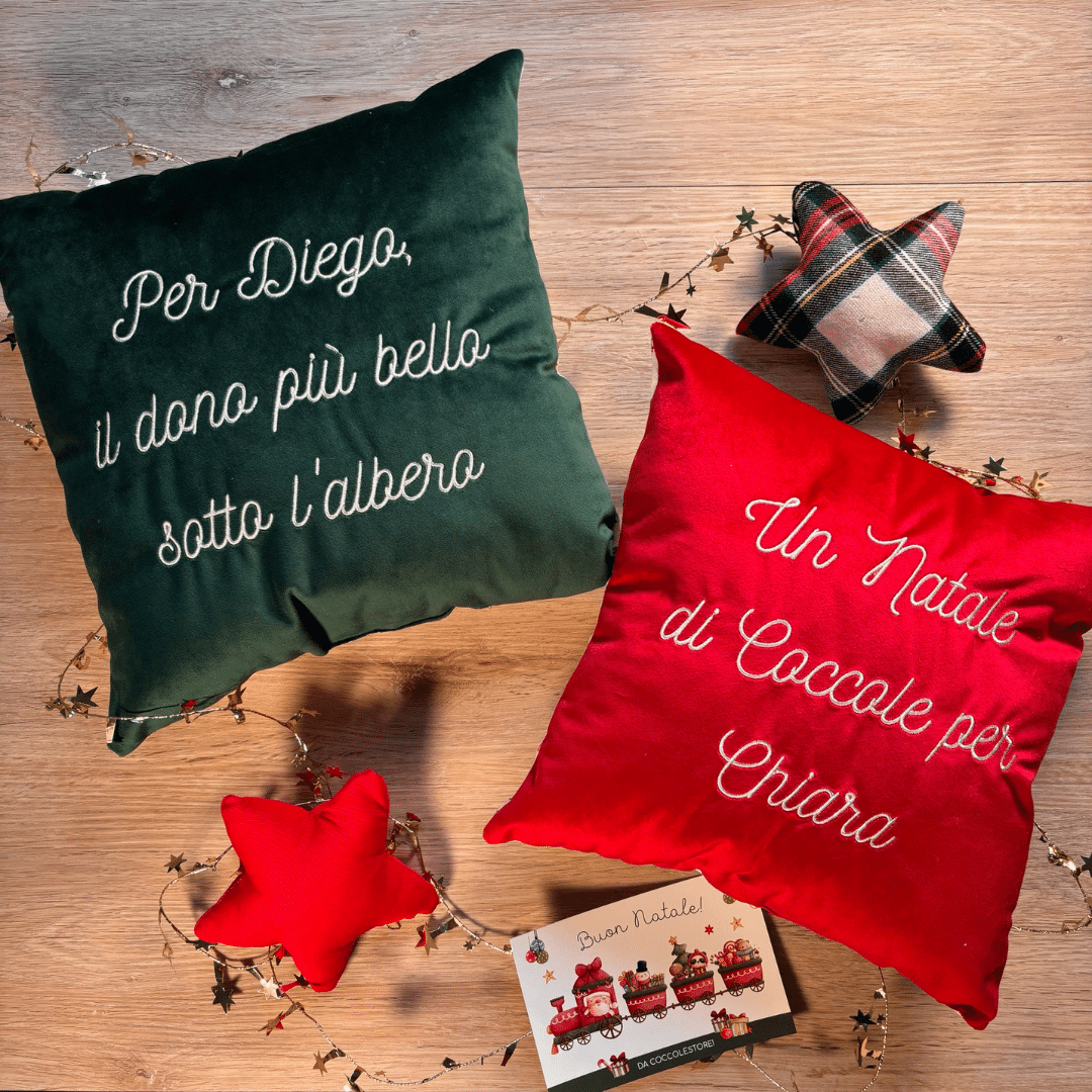 Ogni cuscino può essere ricamato con una frase personalizzata, un nome o una dedica speciale, rendendolo ideale per Natale, Festa della Mamma, del Papà, San Valentino, compleanni o semplicemente per dire “ti voglio bene”.