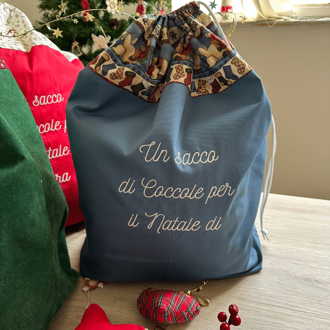 La sacca è impreziosita dalla frase “Un sacco di Coccole per il Natale di”, ricamata con filato di qualità, a cui segue la personalizzazione del nome del bambino o della bambina. Un dettaglio che rende ogni dono ancora più speciale e personale.