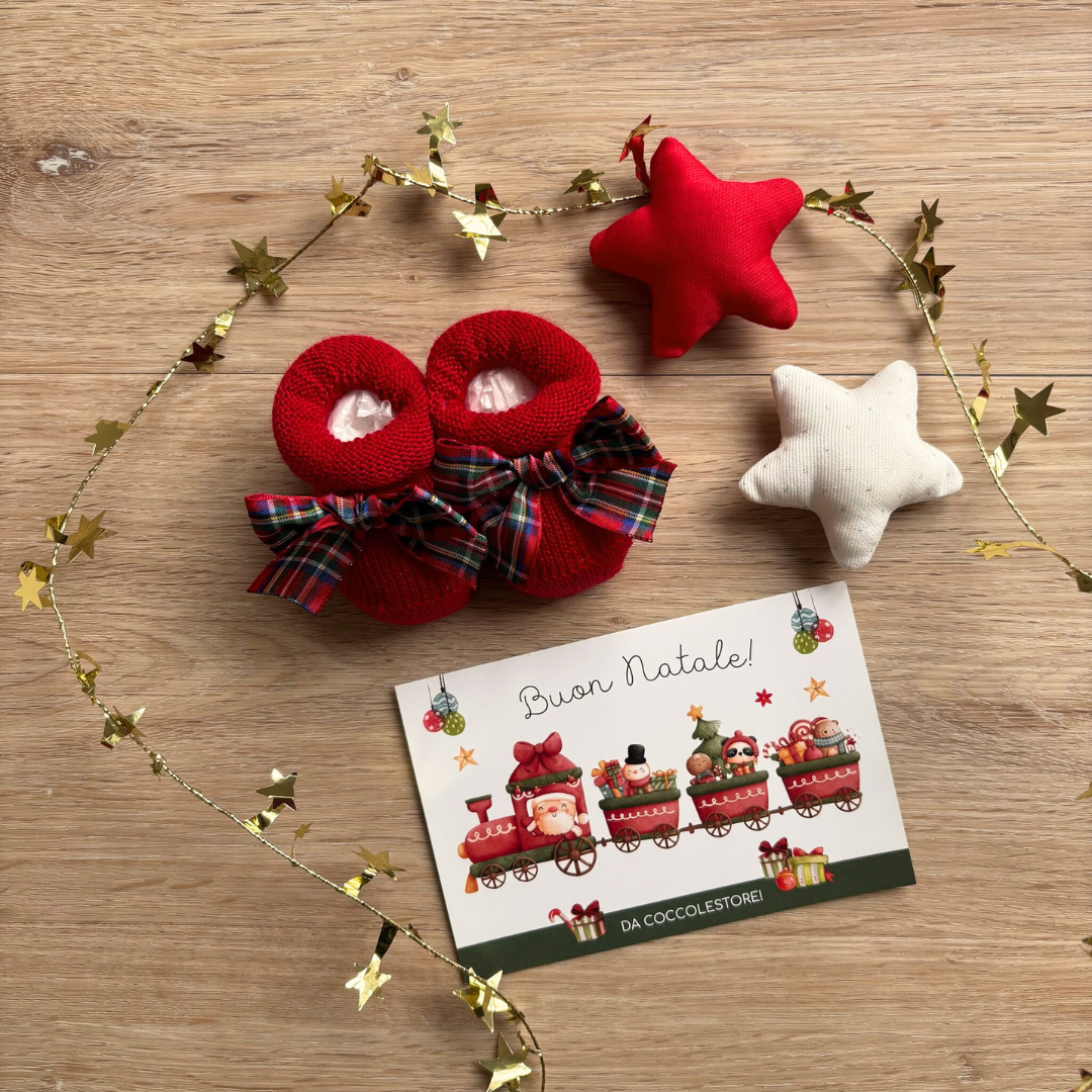 Il set è completato da deliziose babbucce in maglia rossa con fiocco in tessuto scozzese, perfette per tenere al caldo i piedini durante le feste. Le finiture curate e i materiali morbidi rendono questo set non solo bellissimo, ma anche pratico e confortevole.