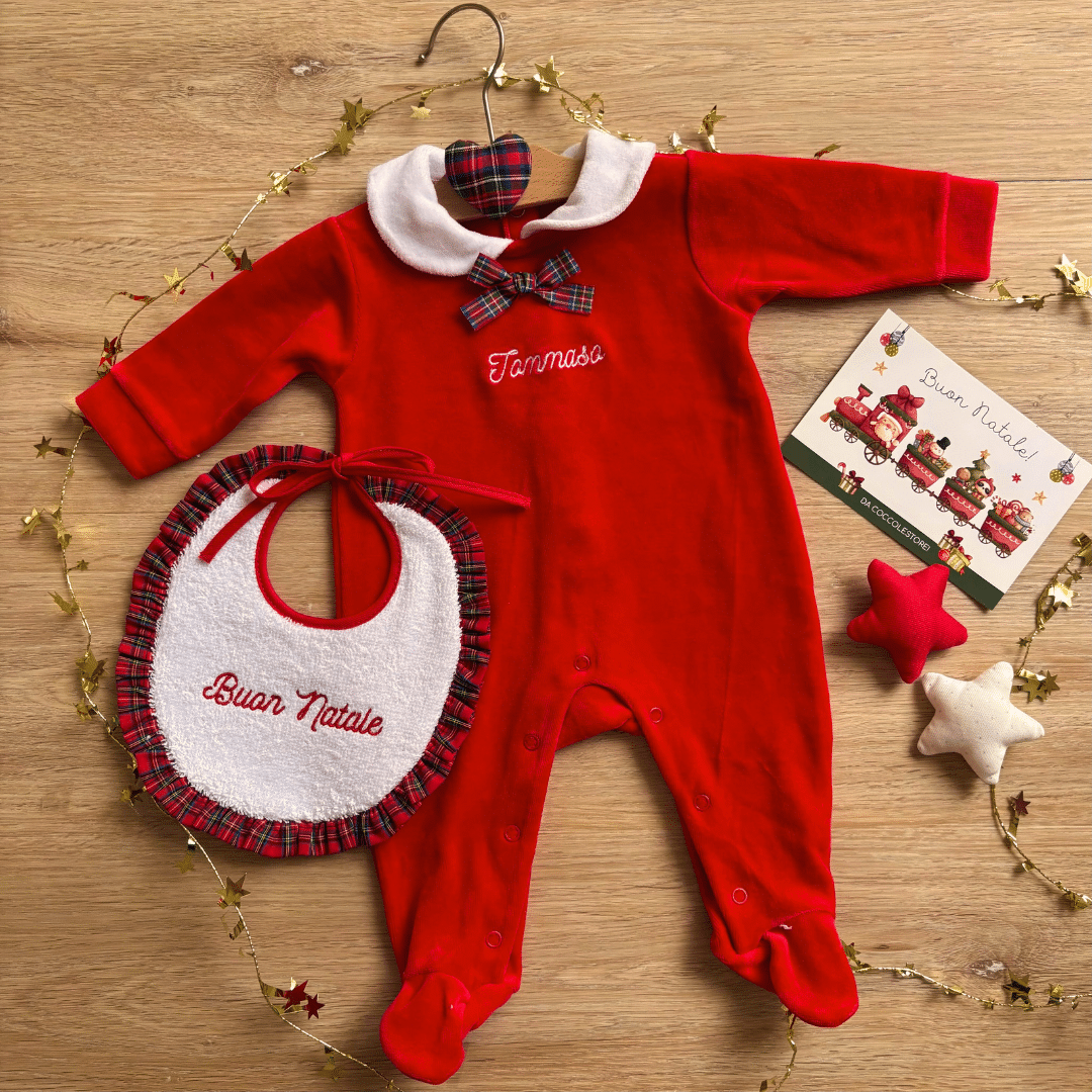 Celebra il primo Natale del tuo bambino o della tua bambina con un set regalo unico, pensato per creare ricordi dolci e indimenticabili. Questo raffinato set natalizio include una tutina in ciniglia rossa, morbida e calda, decorata da un elegante fiocchetto in tessuto tartan scozzese. Il colletto arrotondato aggiunge un tocco classico, mentre la possibilità di personalizzare la tutina con il nome o una frase speciale, la rende un dono esclusivo e dal grande valore affettivo.