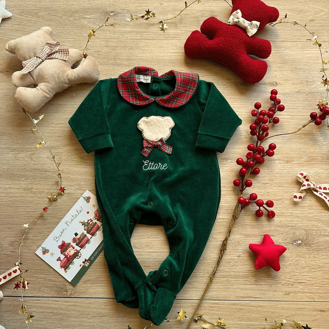 Il dettaglio più tenero? Un simpatico orsetto peloso applicato sul petto, che con il fiocchetto tartan regala un tocco giocoso e festoso al capo. Il colletto in tartan rosso fa subito Natale, la tutina è ideale anche per scattare le prime foto ricordo delle Feste.