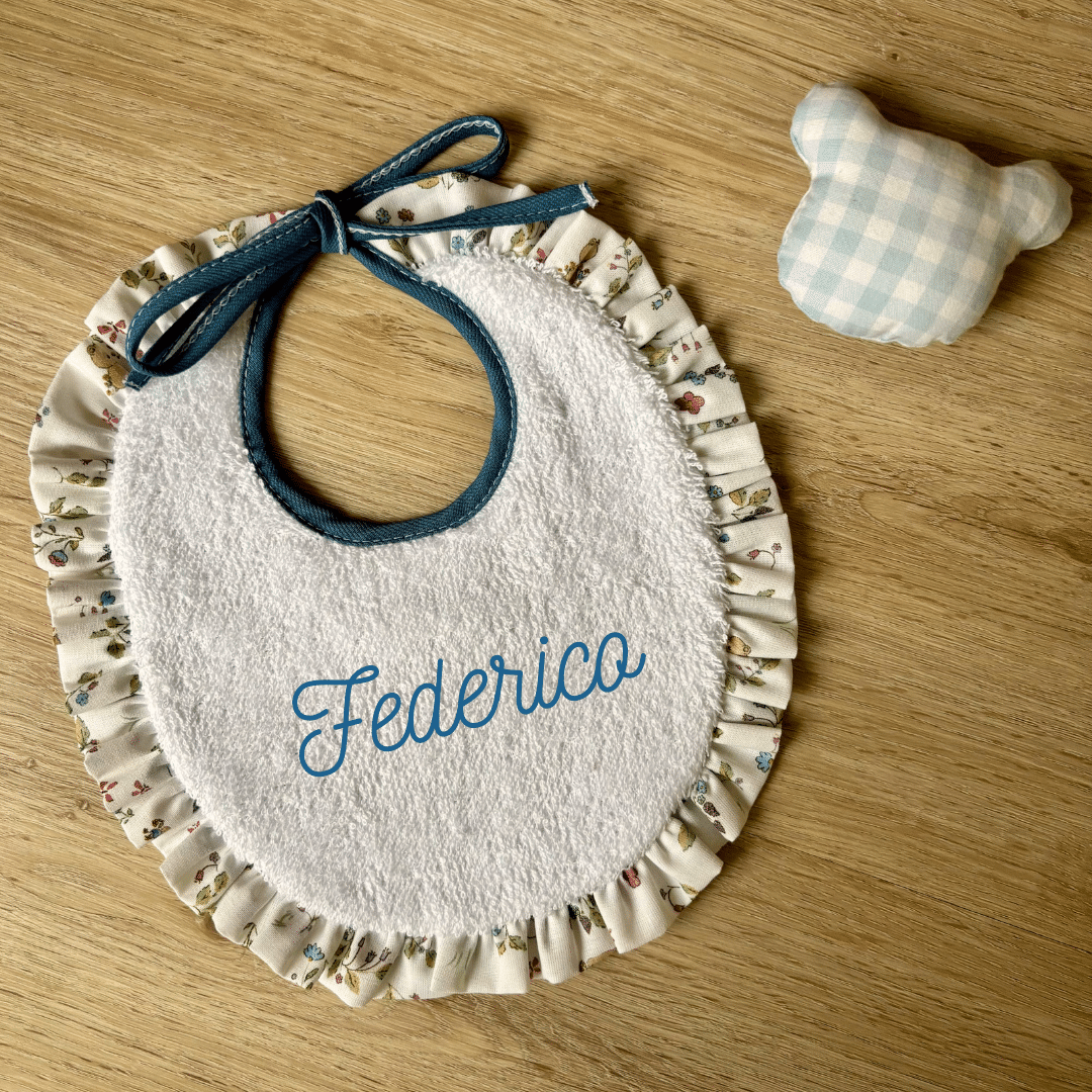 Un bavaglino che unisce dolcezza, praticità e cura sartoriale. Realizzato in soffice spugna di alta qualità e rifinito con un delicato volant in tessuto a tema “Orsetto nel Bosco”, questo bavaglino è pensato per accompagnare i primi momenti della pappa con tenerezza e stile.