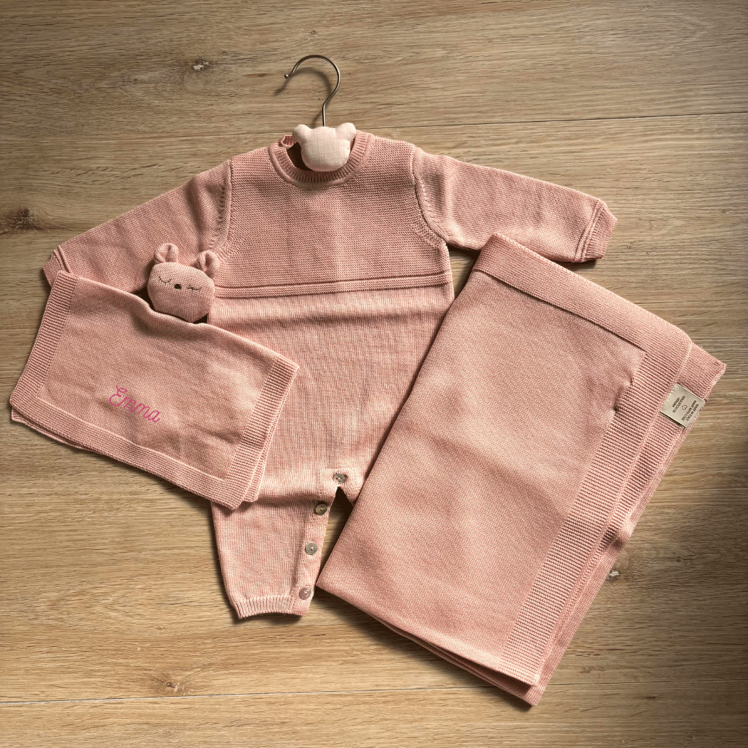 Disponibile in tre varianti delicate e senza tempo — Panna, Cielo e Rosa — questo set è un’idea regalo preziosa per nascita, battesimo o baby shower.