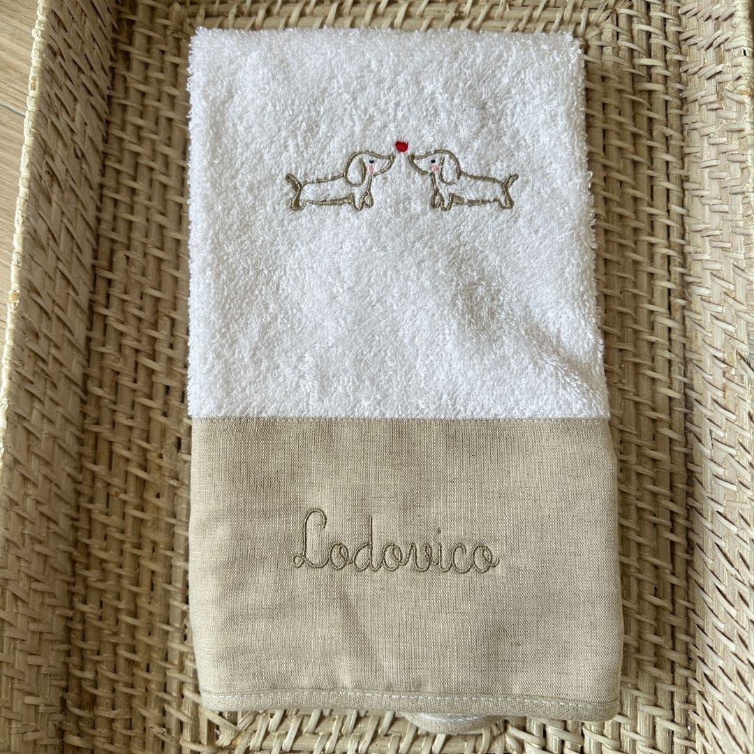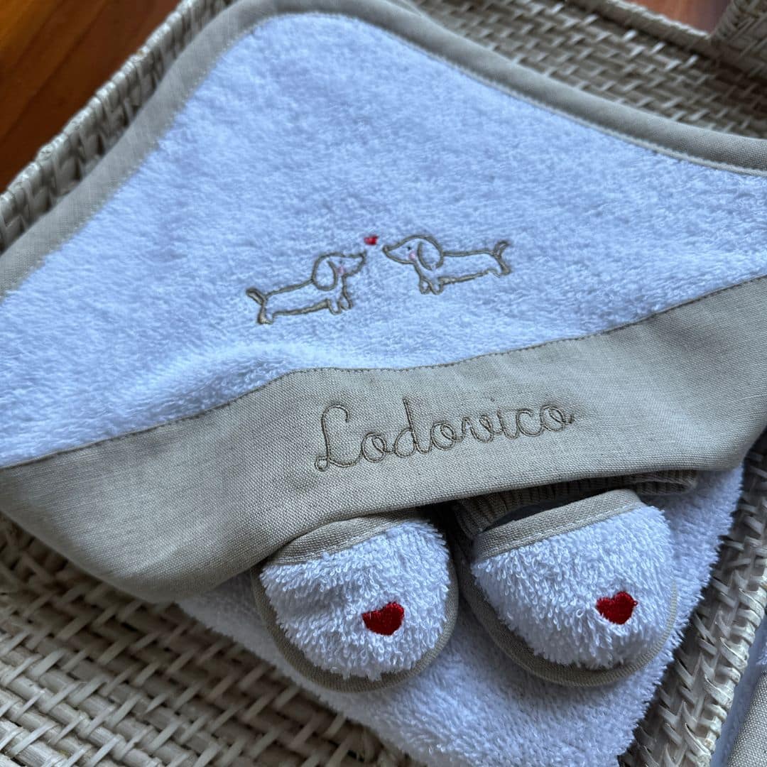 Il Set Bagnetto Personalizzato Bassotti è un tenero e raffinato coordinato in tre pezzi, pensato per accogliere con dolcezza i primi momenti del tuo bambino. Realizzato con il dolcissimo ricamo dei bassotti, è disponibile nel colore ecrù naturale e unisce funzionalità e stile in un’unica proposta regalo.
